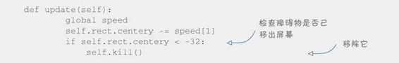 在障碍物类的 update 方法中,我们添加一个判断逻辑,看看障碍物是否已经移出屏幕。如果是的话,就移除它。Pygame 有一个名为 kill 的原生方法可用来做这件事。新的 update 方法看起来像下面这样。