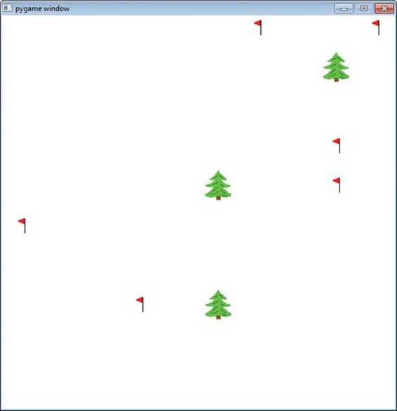 现在我们来创建多个障碍物,以便填充在 640×640 像素的窗口中。我们将 10 个障碍物(小旗和树)随机地分布在 100 个格子中,每个障碍物既可以是小旗也可以是树。最终结果可能是 2 面小旗 8 棵树,7 面小旗 3 棵树,或者是总和为 10 的任意组合。总之,小旗和树是随机选择的,它们的位置也是随机的。