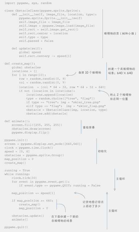 如果运行以上代码,你就能操作滑雪者滑下小山,并且会看到障碍物向上滚过。你也会注意到滑雪者向左右滑和向下滑的速度取决于他的转向。至此,这个游戏已经快要完成了。