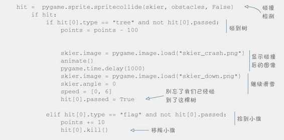 变量 hit 告诉我们滑雪者撞到了哪个障碍物。它是一个列表,但在这里列表中只有一个条目,因为滑雪者一次只可能碰到一个障碍物,所以他碰到的障碍物是 hit[0]。