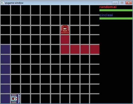 注意,如果你之前运行了本书的安装程序,那么你的计算机中应该已经有 Python Battle 的代码了。我放了三个 AI 程序,你可以一一尝试:CircleAI(在游戏区域中转圈)、RandomAI(随机移动和转向)和 NullAI(什么也不做)。我们来一一运行一下,看看谁会赢。