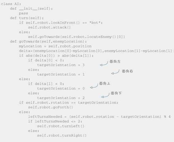 class AI: def __init__(self):pass def turn(self):if self.robot.lookInFront == "bot": self.robot.attack