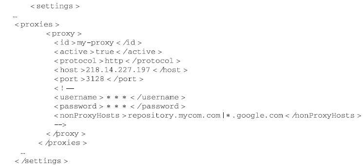 这段配置十分简单,proxies下可以有多个proxy元素,如果声明了多个proxy元素,则默认情况下第一个被激活的proxy会生效。这里声明了一个id为my-proxy的代理,active的值为true表示激活该代理,protocol表示使用的代理协议,这里是http。当然,最重要的是指定正确的主机名(host元素)和端口(port元素)。上述XML配置中注释掉了username、password、nonProxyHost几个元素。当代理服务需要认证时,就需要配置username和password。nonProxyHost元素用来指定哪些主机名不需要代理,可以使用“|”符号来分隔多个主机名。此外,该配置也支持通配符,如*.google.com表示所有以google.com结尾的域名访问都不要通过代理。