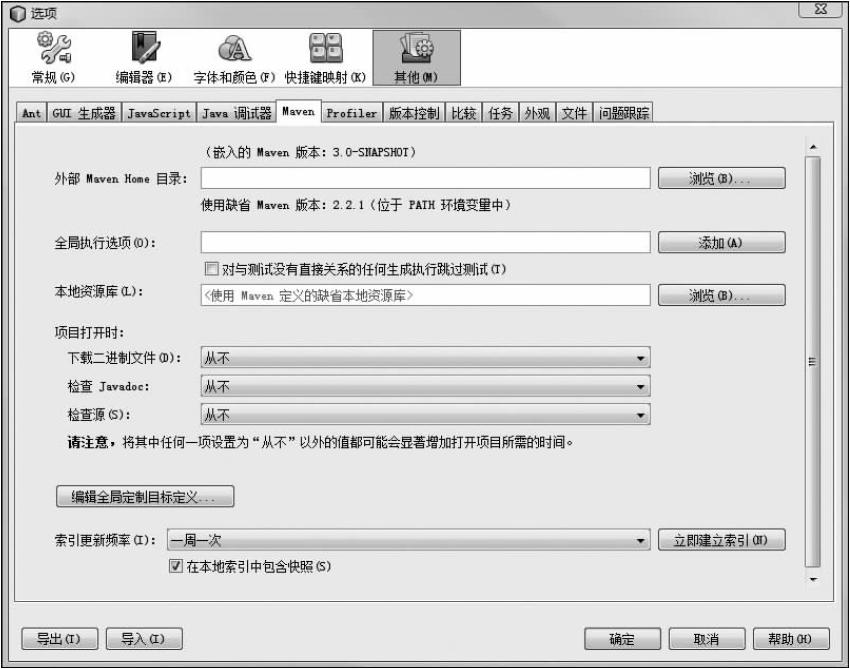 NetBeans Maven插件默认会侦测PATH环境变量,因此会直接使用与命令行一致的Maven环境。依次单击菜单栏中的工具→选项→其他→Maven标签栏,就能看到图2-15所示的配置。
