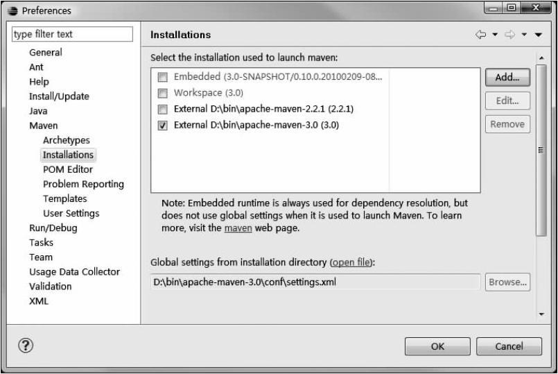 在m2eclipse环境中,单击菜单栏中的Windows,然后选择Preferences,在弹出的对话框中,展开左边的Maven项,选择Installation子项,在右边的面板中,能够看到有一个默认的Embedded Maven安装被选中了。单击Add...按钮,然后选择Maven安装目录M2_HOME,添加完毕之后选择这一个外部的Maven,如图2-14所示。