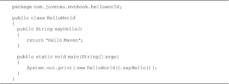 关于该Java代码有两点需要注意。首先,在绝大多数情况下,应该把项目主代码放到src/main/java/目录下(遵循Maven的约定),而无须额外的配置,Maven会自动搜寻该目录找到项目主代码。其次,该Java类的包名是com.juvenxu.mvnbook.helloworld,这与之前在POM中定义的groupId和artifactId相吻合。一般来说,项目中Java类的包都应该基于项目的groupId和artifactId,这样更加清晰,更加符合逻辑,也方便搜索构件或者Java类。
