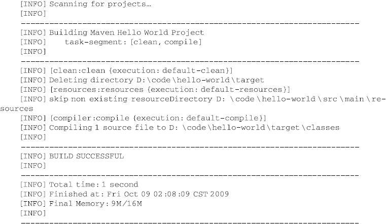 clean告诉Maven清理输出目录target/,compile告诉Maven编译项目主代码,从输出中看到Maven首先执行了clean:clean任务,删除target/目录。默认情况下,Maven构建的所有输出都在target/目录中;接着执行resources:resources任务(未定义项目资源,暂且略过);最后执行compiler:compile任务,将项目主代码编译至target/classes目录(编译好的类为com/juvenxu/mvnbook/helloworld/HelloWorld.Class)。