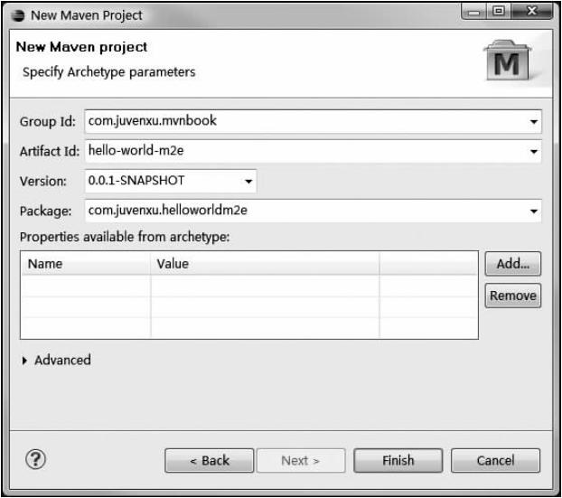 注意,为了不和前面已导入的Hello World项目产生冲突和混淆,这里使用不同的artifactId和package。单击Finish按钮,Maven项目就创建完成了。其结构与前一个已导入的Hello World项目基本一致。
