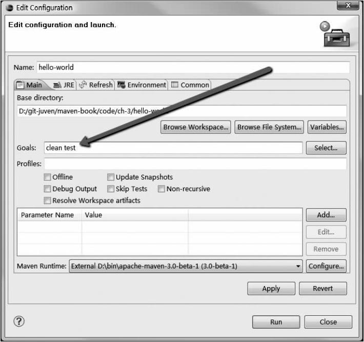 选择想要执行的Maven命令就能执行相应的构建,同时也能在Eclipse的console中看到构建输出。这里常见的一个问题是,默认选项中没有我们想要执行的Maven命令怎么办?比如,默认带有mvn test,但我们想执行mvn clean test,很简单,选择Maven build以自定义Maven运行命令,在弹出对话框的Goals一项中输入我们想要执行的命令,如clean test,设置一下Name,单击Run即可。并且,下一次我们选择Maven build,或者使用快捷键“Alt+Shift+X,M”快速执行Maven构建的时候,上次的配置直接就能在历史记录中找到。图3-5所示就是自定义Maven运行命令的界面。