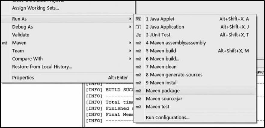 我们需要在命令行输入如mvn clean install之类的命令来执行maven构建,m2eclipse中也有对应的功能。在Maven项目或者pom.xml上右击,再在弹出的快捷菜单中选择Run As,就能看到常见的Maven命令,如图3-4所示。