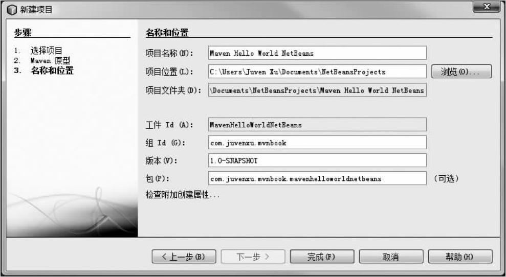 在NetBeans中创建Maven项目同样十分轻松。在菜单栏中选择文件,然后选择新建项目,在弹出的对话框中,选择项目类别为Maven,项目为Maven项目,单击“下一步”按钮之后,对话框会提示我们选择Maven原型(即Maven Archtype)。这里选择Maven快速启动原型(1.0),即前文提到的maven-archetype-quickstart,单击“下一步”按钮之后,输入项目的基本信息。这些信息在之前讨论Archetype及在m2eclipse中创建Maven项目的时候都仔细解释过,这里不再详述,如图3-8所示。