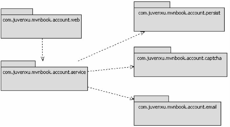 ·com.juvenxu.mvnbook.account.service:系统的核心,它封装了所有下层细节,对外暴露简单的接口。这实际上是一个Facade模式,了解设计模式的读者应该能马上理解。