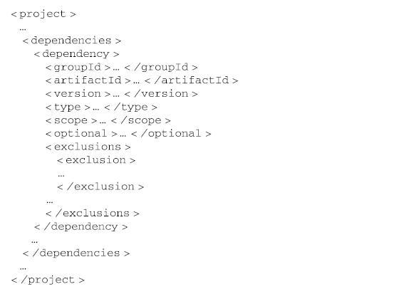 5.3.1节已经罗列了一些简单的依赖配置,读者可以看到依赖会有基本的groupId、artifactId和version等元素组成。其实一个依赖声明可以包含如下的一些元素: