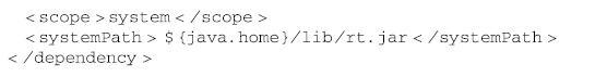 ·system:系统依赖范围。该依赖与三种classpath的关系,和provided依赖范围完全一致。但是,使用system范围的依赖时必须通过systemPath元素显式地指定依赖文件的路径。由于此类依赖不是通过Maven仓库解析的,而且往往与本机系统绑定,可能造成构建的不可移植,因此应该谨慎使用。systemPath元素可以引用环境变量,如: