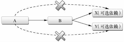假设有这样一个依赖关系,项目A依赖于项目B,项目B依赖于项目X和Y,B对于X和Y的依赖都是可选依赖:A->B、B->X(可选)、B->Y(可选)。根据传递性依赖的定义,如果所有这三个依赖的范围都是compile,那么X、Y就是A的compile范围传递性依赖。然而,由于这里X、Y是可选依赖,依赖将不会得以传递。换句话说,X、Y将不会对A有任何影响,如图5-3所示。