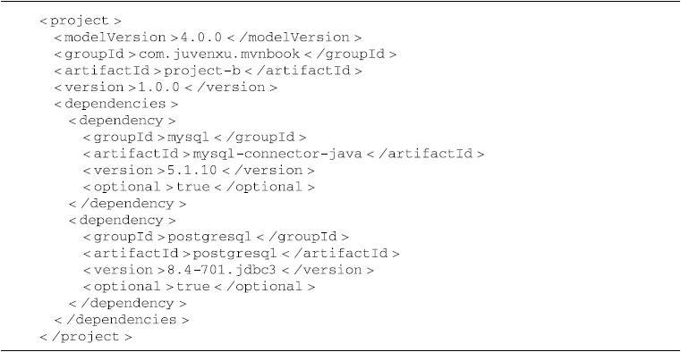 最后,关于可选依赖需要说明的一点是,在理想的情况下,是不应该使用可选依赖的。前面我们可以看到,使用可选依赖的原因是某一个项目实现了多个特性,在面向对象设计中,有个单一职责性原则,意指一个类应该只有一项职责,而不是糅合太多的功能。这个原则在规划Maven项目的时候也同样适用。在上面的例子中,更好的做法是为MySQL和PostgreSQL分别创建一个Maven项目,基于同样的groupId分配不同的artifactId,如com.juvenxu.mvnbook:project-b-mysql和com.juvenxu.mvnbook:project-b-postgresql,在各自的POM中声明对应的JDBC驱动依赖,而且不使用可选依赖,用户则根据需要选择使用project-b-mysql或者project-b-postgresql。由于传递性依赖的作用,就不用再声明JDBC驱动依赖。