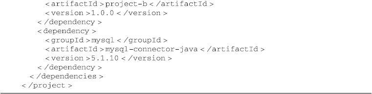 上述XML代码片段中,使用<optional>元素表示mysql-connector-java和postgresql这两个依赖为可选依赖,它们只会对当前项目B产生影响,当其他项目依赖于B的时候,这两个依赖不会被传递。因此,当项目A依赖于项目B的时候,如果其实际使用基于MySQL数据库,那么在项目A中就需要显式地声明mysql-connector-java这一依赖,见代码清单5-8。