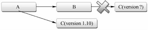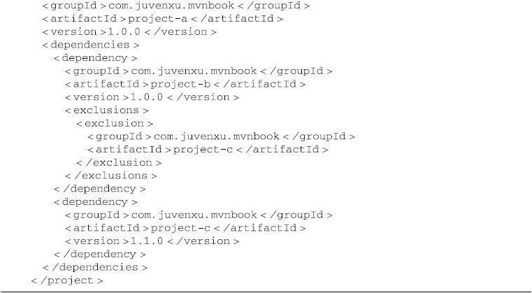 上述代码中,项目A依赖于项目B,但是由于一些原因,不想引入传递性依赖C,而是自己显式地声明对于项目C 1.1.0版本的依赖。代码中使用exclusions元素声明排除依赖,exclusions可以包含一个或者多个exclusion子元素,因此可以排除一个或者多个传递性依赖。需要注意的是,声明exclusion的时候只需要groupId和artifactId,而不需要version元素,这是因为只需要groupId和artifactId就能唯一定位依赖图中的某个依赖。换句话说,Maven解析后的依赖中,不可能出现groupId和artifactId相同,但是version不同的两个依赖,这一点在5.6节中已做过解释。该例的依赖解析逻辑如图5-4所示。