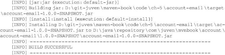 install插件的install目标将项目的构建输出文件安装到本地仓库。在上述输出中,构建输出文件是account-email-1.0.0-SNAPSHOT.jar,本地仓库地址是D:\java\repository,Maven使用Install插件将该文件复制到本地仓库中,具体的路径根据坐标计算获得。计算逻辑请参考6.2节。