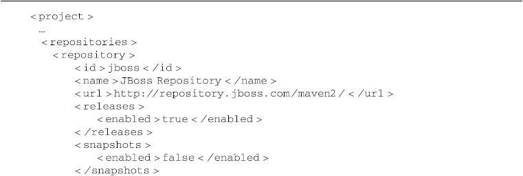 在很多情况下,默认的中央仓库无法满足项目的需求,可能项目需要的构件存在于另外一个远程仓库中,如JBoss Maven仓库。这时,可以在POM中配置该仓库,见代码清单6-2。