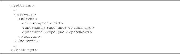 假设需要为一个id为my-proj的仓库配置认证信息,编辑settings.xml文件见代码清单6-3: