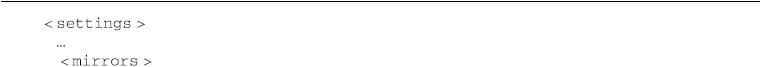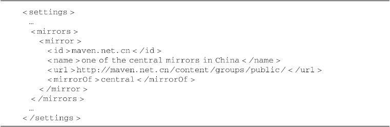 该例中,<mirrorOf>的值为central,表示该配置为中央仓库的镜像,任何对于中央仓库的请求都会转至该镜像,用户也可以使用同样的方法配置其他仓库的镜像。另外三个元素id、name、url与一般仓库配置无异,表示该镜像仓库的唯一标识符、名称以及地址。类似地,如果该镜像需要认证,也可以基于该id配置仓库认证。
