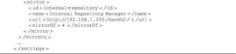 该例中<mirrorOf>的值为星号,表示该配置是所有Maven仓库的镜像,任何对于远程仓库的请求都会被转至http://192.168.1.100/maven2/。如果该镜像仓库需要认证,则配置一个id为internal-repository的<server>即可,详见第5.4节。