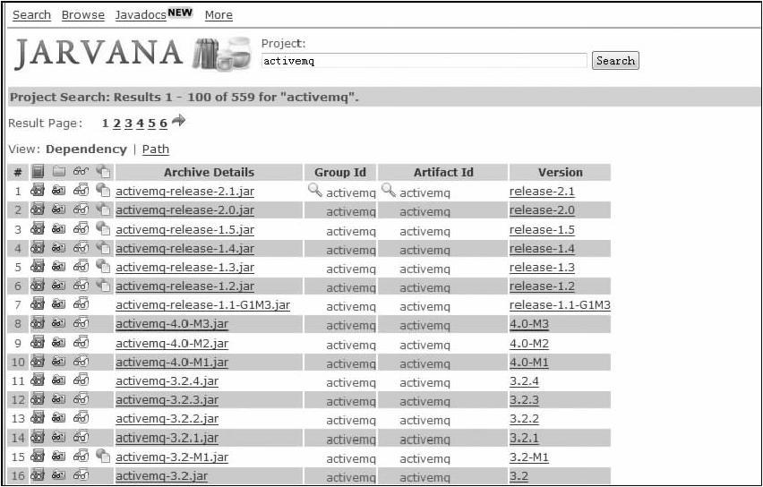地址:http://www.jarvana.com/jarvana/ Jarvana提供了基于关键字、类名的搜索,构件下载、依赖声明片段等功能也一应俱全。值得一提的是,Jarvana还支持浏览构件内部的内容。此外,Jarvana还提供了便捷的Java文档浏览的功能。Jarvana的搜索结果页面如图6-4所示。 图6-4 Jarvana仓库搜索服务