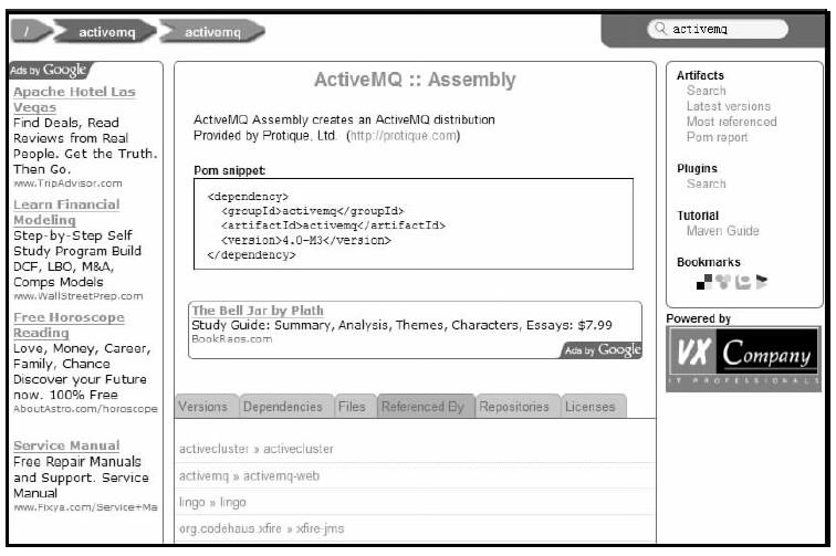 地址:http://www.mvnbrowser.com MVNbrowser只提供关键字搜索的功能,除了提供基于坐标的依赖声明代码片段等基本功能之外,MVNbrowser的一大特色就是,能够告诉用户该构件的依赖于其他哪些构件(Dependencies)以及该构件被哪些其他构件依赖(Referenced By),如图6-5所示。 图6-5 MVNbrowser仓库搜索服务