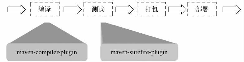 虽然上述代码和Maven实际代码相去甚远,Maven的生命周期包含更多的步骤和更复杂的逻辑,但它们的基本理念是相同的。生命周期抽象了构建的各个步骤,定义了它们的次序,但没有提供具体实现。那么谁来实现这些步骤呢?不能让用户为了编译而写一堆代码,为了测试又写一堆代码,那不就成了大家在重复发明轮子吗?Maven当然必须考虑这一点,因此它设计了插件机制。每个构建步骤都可以绑定一个或者多个插件行为,而且Maven为大多数构建步骤编写并绑定了默认插件。例如,针对编译的插件有maven-compiler-plugin,针对测试的插件有maven-surefire-plugin等。虽然在大多数时间里,用户几乎都不会觉察到插件的存在,但实际上编译是由maven-compiler-plugin完成的,而测试是由maven-surefire-plugin完成的。当用户有特殊需要的时候,也可以配置插件定制构建行为,甚至自己编写插件。生命周期和插件的关系如图7-1所示。