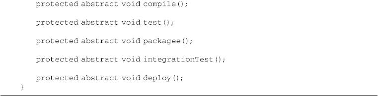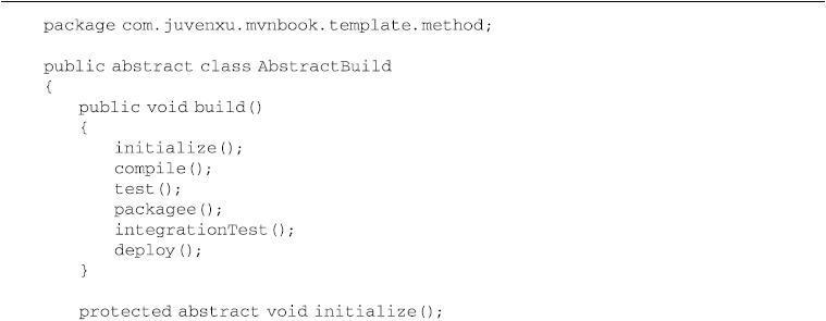 Maven的生命周期是抽象的,这意味着生命周期本身不做任何实际的工作,在Maven的设计中,实际的任务(如编译源代码)都交由插件来完成。这种思想与设计模式中的模板方法(Template Method)非常相似。模板方法模式在父类中定义算法的整体结构,子类可以通过实现或者重写父类的方法来控制实际的行为,这样既保证了算法有足够的可扩展性,又能够严格控制算法的整体结构。如下的模板方法抽象类能够很好地体现Maven生命周期的概念,见代码清单7-1。