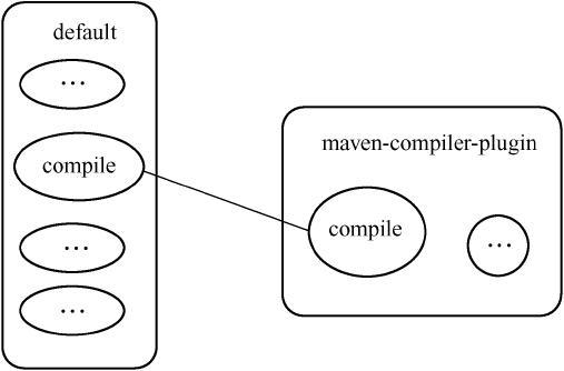 Maven的生命周期与插件相互绑定,用以完成实际的构建任务。具体而言,是生命周期的阶段与插件的目标相互绑定,以完成某个具体的构建任务。例如项目编译这一任务,它对应了default生命周期的compile这一阶段,而maven-compiler-plugin这一插件的compile目标能够完成该任务。因此,将它们绑定,就能实现项目编译的目的,如图7-2所示。 图7-2 生命周期阶段与插件目标绑定