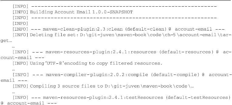 读者可以从Maven的命令行输出中看到在项目构建过程执行了哪些插件目标,例如基于account-email执行mvn clean install命令,可以看到如下输出,见代码清单7-2。