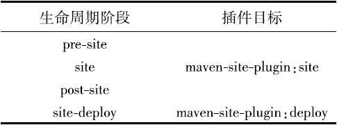 site生命周期有pre-site、site、post-site和site-deploy四个阶段,其中,site和maven-site-plugin:site相互绑定,site-deploy和maven-site-plugin:depoy相互绑定。maven-site-plugin有很多目标,其中,site目标用来生成项目站点,deploy目标用来将项目站点部署到远程服务器上。site生命周期阶段与插件目标的绑定关系如表7-2所示。