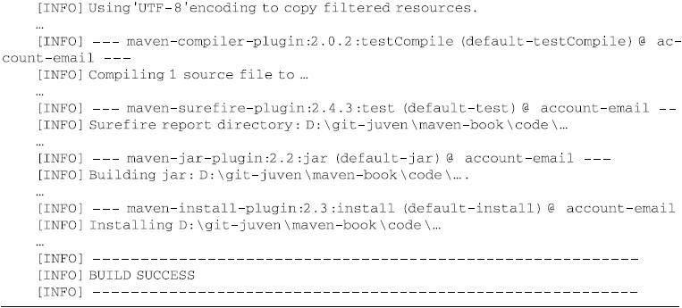 从输出中可以看到,执行的插件目标依次为maven-clean-plugin:clean、maven-resources-plugin:resources、maven-compiler-plugin:compile、maven-resources-plugin:testResources、maven-compiler-plugin:testCompile、maven-surefire-plugin:test、maven-jar-plugin:jar和maven-install-plugin:install。我们知道,mvn clean install命令实际调用了clean生命周期的pre-clean、clean阶段,以及default生命周期的从validate至install所有阶段。在此基础上,通过对照表7-1和表7-3,就能从理论上得到将会执行的插件目标任务,而实际的输出完全验证了这一点。