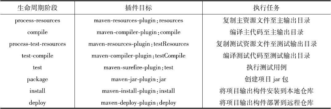 表7-3 default生命周期的内置插件绑定关系及具体任务(打包类型:jar)