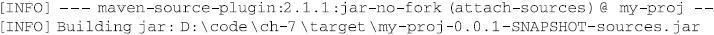 上述配置中,除了基本的插件坐标声明外,还有插件执行配置,executions下每个execution子元素可以用来配置执行一个任务。该例中配置了一个id为attach-sources的任务,通过phrase配置,将其绑定到verify生命周期阶段上,再通过goals配置指定要执行的插件目标。至此,自定义插件绑定完成。运行mvn verify就能看到如下输出: