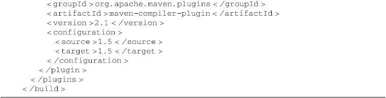 用户可以在声明插件的时候,对此插件进行一个全局的配置。也就是说,所有该基于该插件目标的任务,都会使用这些配置。例如,我们通常会需要配置maven-compiler-plugin告诉它编译Java 1.5版本的源文件,生成与JVM 1.5兼容的字节码文件,见代码清单7-4。