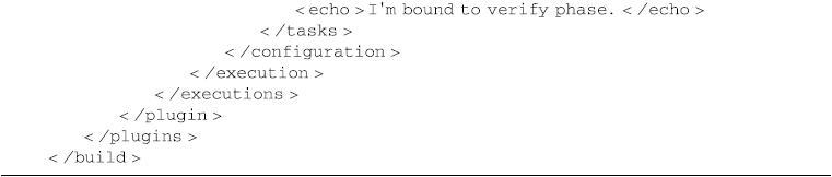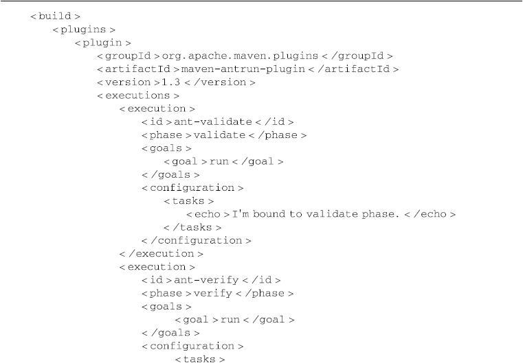 在上述代码片段中,首先,maven-antrun-plugin:run与validate阶段绑定,从而构成一个id为ant-validate的任务。插件全局配置中的configuration元素位于plugin元素下面,而这里的configuration元素则位于execution元素下,表示这是特定任务的配置,而非插件整体的配置。这个ant-validate任务配置了一个echo Ant任务,向命令行输出一段文字,表示该任务是绑定到validate阶段的。第二个任务的id为ant-verify,它绑定到了verify阶段,同样它也输出一段文字到命令行,告诉该任务绑定到了verify阶段。