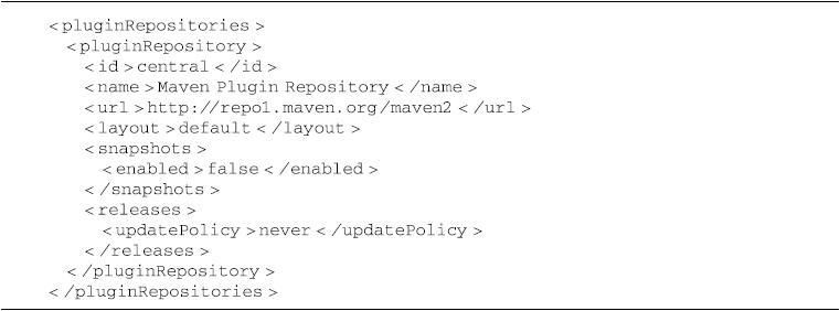 除了pluginRepositories和pluginRepository标签不同之外,其余所有子元素表达的含义与第6.4节所介绍的依赖远程仓库配置完全一样。我们甚至看到,这个默认插件仓库的地址就是中央仓库,它关闭了对SNAPSHOT的支持,以防止引入SNAPSHOT版本的插件而导致不稳定的构建。