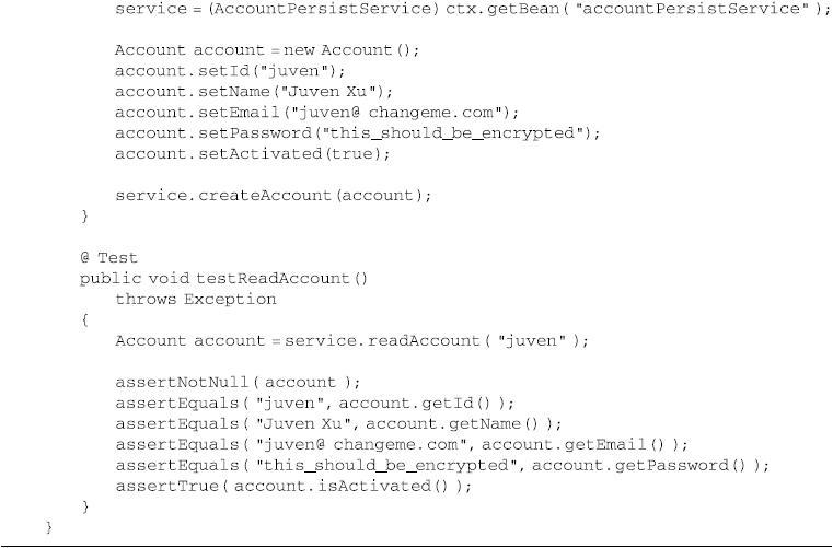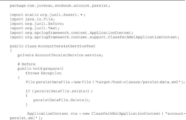 该测试用例使用与AccountPersistService一致的包名,它有两个方法:prepare()与testReadAccount()。其中prepare()方法使用了@Before标注,表示在执行测试用例之前执行该方法。它首先检查数据存储文件是否存在,如果存在则将其删除以得到干净的测试环境,接着使用account-persist.xml配置文件初始化SpringFramwork的IoC容器,再从容器中获取要测试的AccountPersistService对象。最后,prepare()方法创建一个Account对象,设置对象字段的值之后,使用AccountPersistService的createAccount()方法将其持久化。