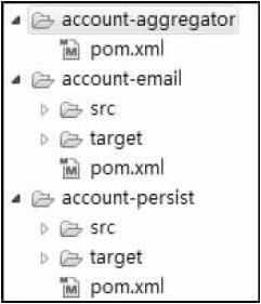 为了方便用户构建项目,通常将聚合模块放在项目目录的最顶层,其他模块则作为聚合模块的子目录存在,这样当用户得到源码的时候,第一眼发现的就是聚合模块的POM,不用从多个模块中去寻找聚合模块来构建整个项目。图8-1所示为account-aggregator与另外两个模块的目录结构关系。