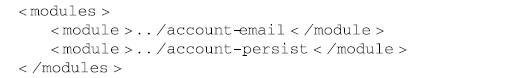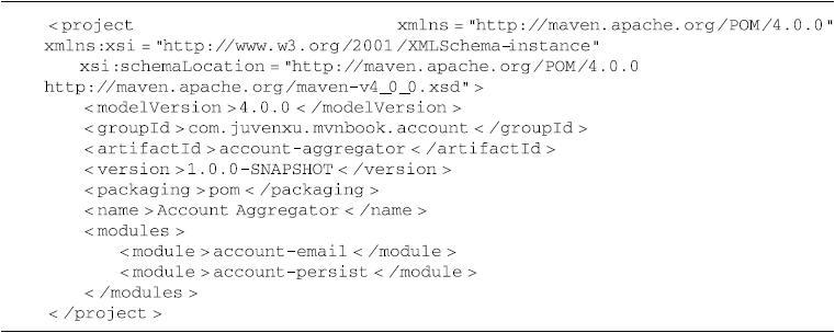 为了能够使用一条命令就能构建account-email和account-persist两个模块,我们需要创建一个额外的名为account-aggregator的模块,然后通过该模块构建整个项目的所有模块。account-aggregator本身作为一个Maven项目,它必须要有自己的POM,不过,同时作为一个聚合项目,其POM又有特殊的地方。如下为account-aggregator的pom.xml内容,见代码清单8-9。