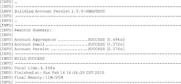最后,为了得到直观的感受,看一下从聚合模块运行mvn clean install命令会得到怎样的输出: