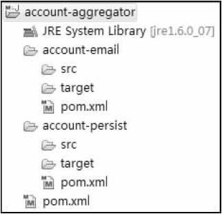 从图8-1中能够看到,account-aggregator的内容仅是一个pom.xml文件,它不像其他模块那样有src/main/java、src/test/java等目录。这也是容易理解的,聚合模块仅仅是帮助聚合其他模块构建的工具,它本身并无实质的内容。