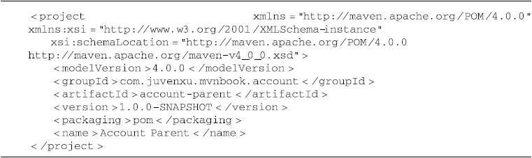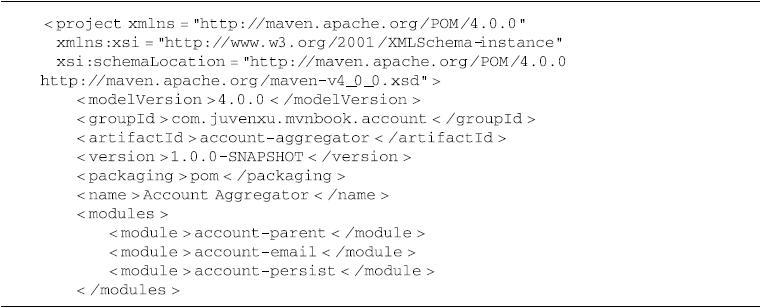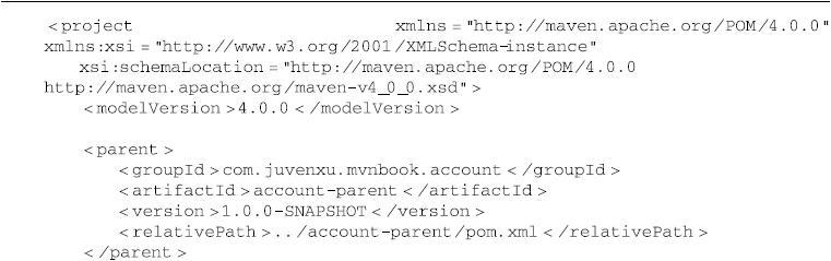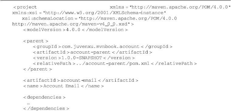 这个更新过的POM没有为account-email声明groupId和version,不过这并不代表account-email没有groupId和version。实际上,这个子模块隐式地从父模块继承了这两个元素,这也就消除了一些不必要的配置。在该例中,父子模块使用同样的groupId和version,如果遇到子模块需要使用和父模块不一样的groupId或者version的情况,那么用户完全可以在子模块中显式声明。对于artifactId元素来说,子模块应该显式声明,一方面,如果完全继承groupId、artifactId和version,会造成坐标冲突;另一方面,即使使用不同的groupId或version,同样的artifactId容易造成混淆。