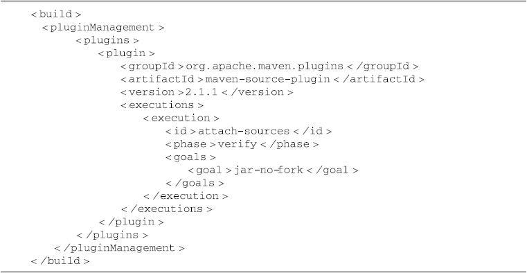 7.4.2节中配置了maven-source-plugin,将其jar-no-fork目标绑定到了verity生命周期阶段,以生成项目源码包。如果一个项目中有很多子模块,并且需要得到所有这些模块的源码包,那么很显然,为所有模块重复类似的插件配置不是最好的办法。这时更好的方法是在父POM中使用pluginManagement配置插件,见代码清单8-18。