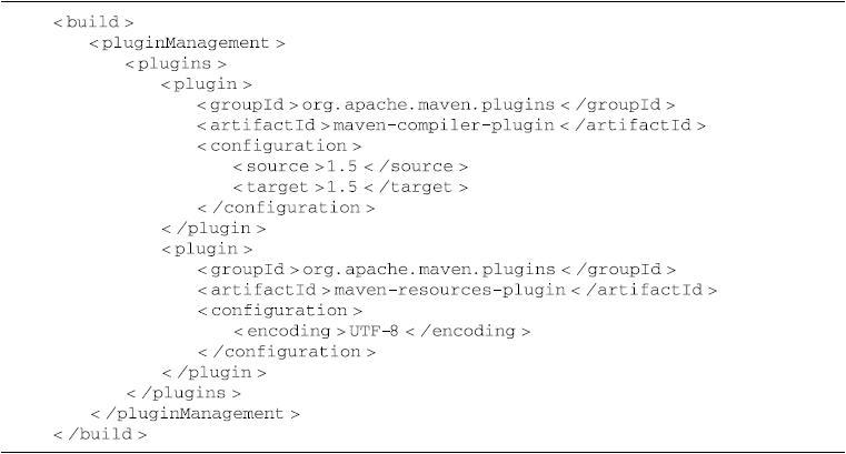 有了pluginManagement元素,account-email和account-persist的POM也能得以简化了,它们都配置了maven-compiler-plugin和maven-resources-plugin。可以将这两个插件的配置移到account-parent的pluginManagement元素中,见代码清单8-20。