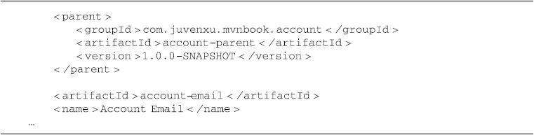 相应地,account-email和account-persist的POM配置也要做微小的修改。本来account-parent和它们位于同级目录,因此需要使用值为../account-parent/pom.xml的relativePath元素。现在新的account-parent在上一层目录,这是Maven默认能识别的父模块位置,因此不再需要配置relativePath,见代码清单8-22。