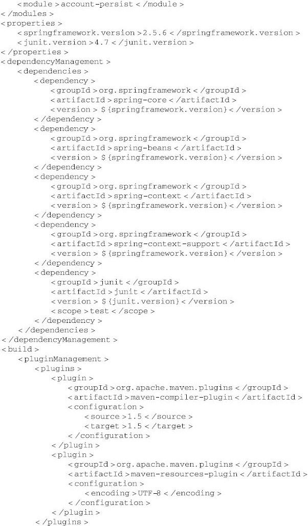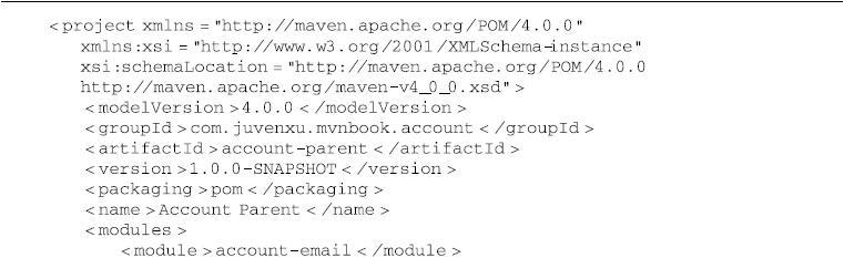 在代码清单8-21中可以看到,该POM的打包方式为pom,它包含了一个modules元素,表示用来聚合account-persist和account-email两个模块,它还包含了properties、dependencyManagement和pluginManagement元素供子模块继承。
